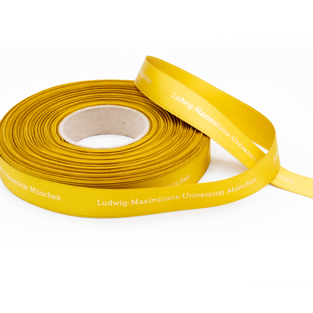 Edles Satin-Geschenkband in der Farbe "Honig", mit LMU Schriftzug gold geprägt.