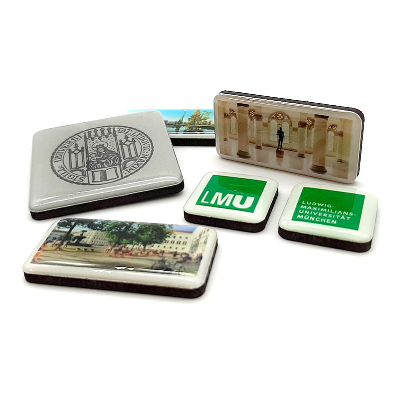Magnetset mit 7 Magneten. Abgebildet sind Highlights im Hauptgebäude der LMU München sowie das ikonische Siegel und das Logo der LMU München.